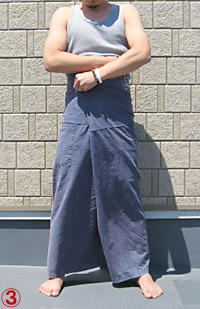 さっと穿いて、ぐっと縛って、ひょいっとウエスト布を折り返すだけ。