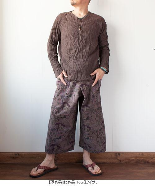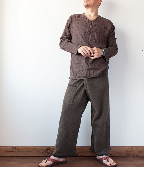 こちらはまだらなかすれた色味のタイパンツ。ブラックとブラウンの2色。