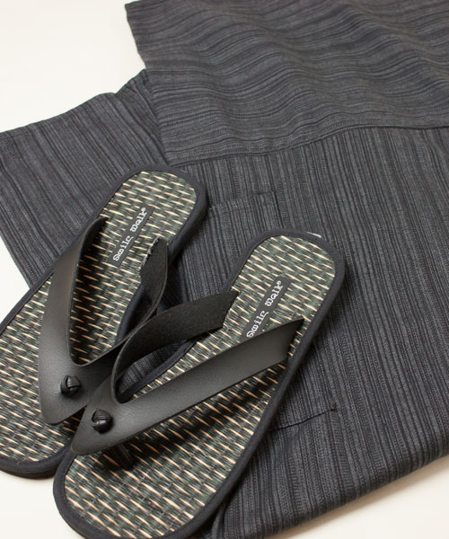 黒のストライプ織りタイパンツとサンダルの”黒”でまとめた2点セット。