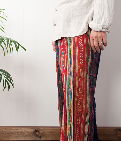 1つは、無地・ろうけつ染め・刺繍のコンビネーションが絶妙なタイパンツ。