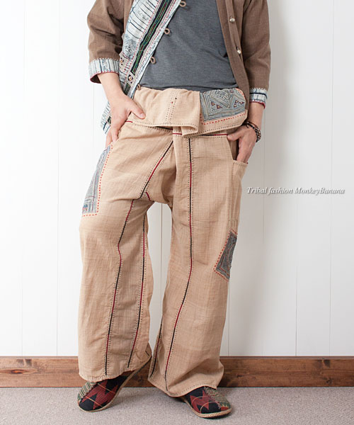 脚やウエスト折り返しのモン族バティックが渋いイカしたタイパンツ。