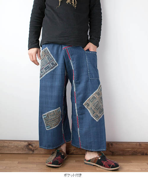 不規則な配置でペタペタとアップリケされたエスニックなタイパンツ。